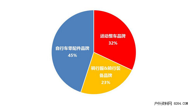 2014年,中国运动自行车市场中自行车零配件品牌占比高达45%,整车品牌总数292个,占品牌总数的32%,骑行服和装备占23%。