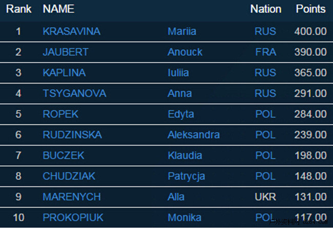 女子速度赛前,法国的Anouck Jaubert和俄罗斯的Lullia Kaplina均积310分,并列第一。此战,而且是最后一站,两人对抗的激烈程度,不言而喻。最终,Lullia Kaplina表现更佳,拿下这站比赛冠军,从而登上年度总冠军宝座。