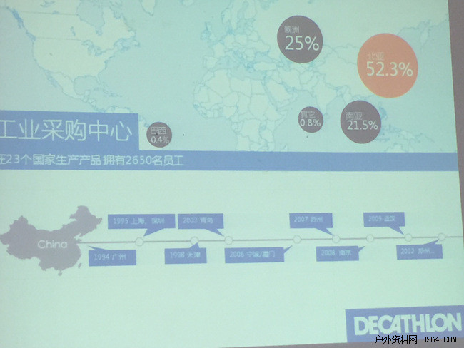 霍曼(Romain BAILLIVET),迪卡侬上海工业采购部总经理介绍说,迪卡侬在全球23个国家设有采购中心,其中每年产额的52%来自北亚,而中国的工业采购基地每年的产量又约占到迪卡侬全球的40%,可见中国制造在全球的重要分量。
