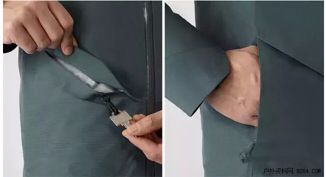 下侧口袋采用双层口袋设计:外层为无接缝线的下插口袋,带盖提供更优的防水性与密封性,内部配有拉绳,可放置如钥匙等物品;内层为斜插拉链侧袋,既兼顾人体的肢体习惯,同时具有置物功能,隐形拉链封闭后可有效防止袋内物品滑出。