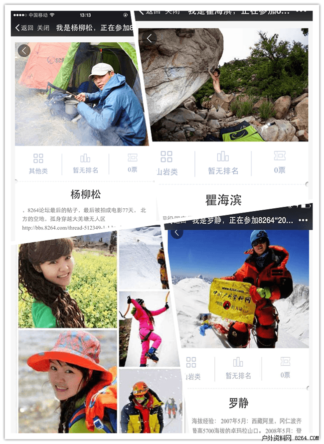 由8264户外资料网主办的2015年度户外圈KOL人物评选活动自2015年11月3日正式启动以来,受到了户外圈中的牛人大咖高度关注,短短几天时间,报名人数已接近千人。在已报名中我们看到了户外运动中不同领域的大咖,如,中国女子中长跑项目的当家花旦之一孙英杰;UTMB的中国跑者于雷;已登顶数座8000米山峰女登山者白天罗静;《北方的空地》作者杨柳松;马拉松选手邢如伶,攀岩运动员瞿海滨等。期待更多的牛人大咖参与到评选中来。