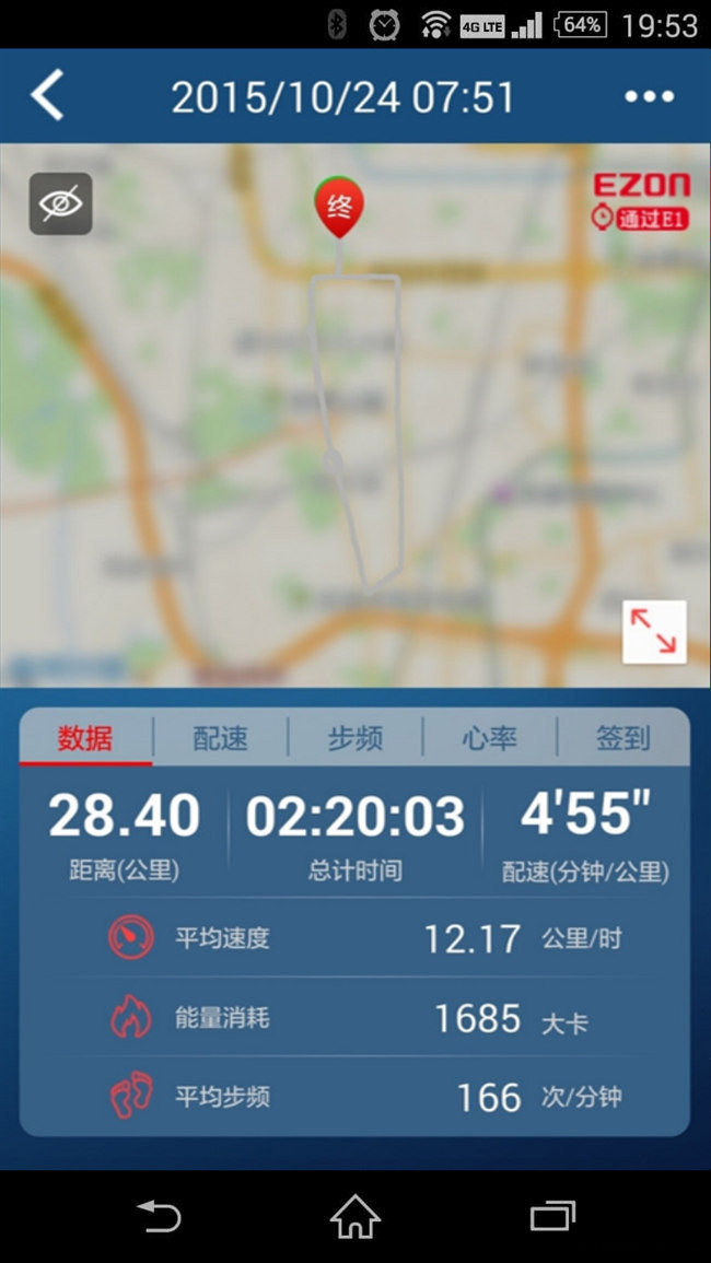干货部分:跑步结束后,手表会显示本次跑步的数据,分别为时间/距离/配速和最大心率/平均心率/热量消耗。这些信息简单而实用,没有其他冗余的数据。进入某次运动数据中时,可以查看总体数据信息、配速、步频、心率、签到(记圈)信息。最有意思的是 App 提供了地图隐藏功能,点击左侧的眼睛图案,就可以控制是否显示地图。这样分享出去的数据就只能看清轨迹,而看不到地图的信息。从某种程度上增加了隐私保护。分享数据可以到微博、微信、朋友圈主流的社交工具上。