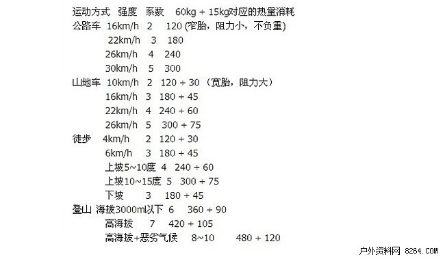 主要户外运动方式每小时消耗的热量(Mets系数×(体重+负重)=卡路里)