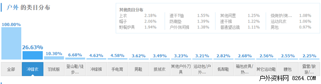 从户外类目分布来看,冲锋衣占26.63%居于第一,羽绒服、登山鞋分别为第二和第三。