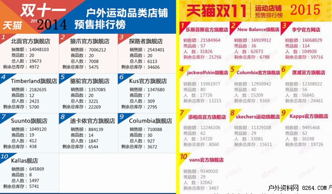 虽然2015年“双11”数据仅仅是12:00之前的,但我们仍旧可以看到,国内品牌探路者和骆驼户外始终牢牢占据前两位,但在后面名次的争夺中,国际品牌的比重在增加。如果我们对比最近两年的预售排行榜,这一趋势则更为明显。