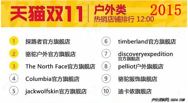 在2015天猫双11购物节期间,探路者集团携旗下两大品牌最终以1.73亿的总交易额再次卫冕户外类目冠军。其中探路者品牌淘宝大盘销售额1.38亿,仅官方旗舰店单店销量便已破亿。美国高端户外品牌DiscoveryExpedition开场5分钟即破去年全天销售记录,最终成交额定格3400万,较去年同期翻了三番。
