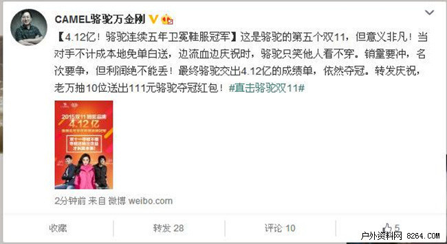 据淘宝官方数据显示,11日0点25分骆驼整体销量破亿,同比去年破亿时间整整缩短了一半。截至12日0点,骆驼交上了最终4.12亿的成绩单,成功问鼎鞋服品牌冠军宝座。同时,CAMEL骆驼总经理万金刚也在朋友圈发声,为今年双十一之战做了深刻的总结。