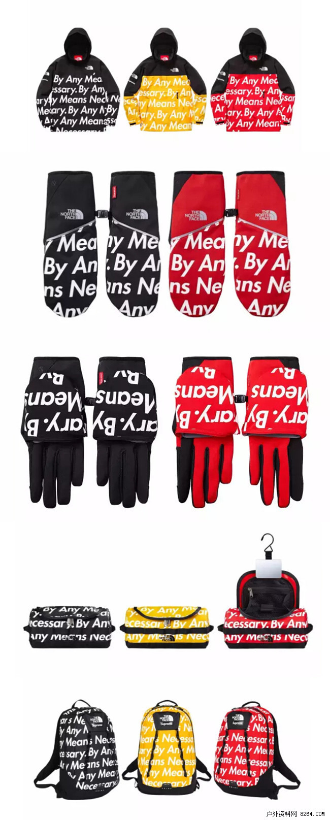 纽约街头皇牌 Supreme 在早前带来与 Levi's 的特辑后,日前再度更新与经典户外品牌 The North Face 合作打造的 2015 秋冬联名系列。此番双方发布 Nuptse Jacket、Mountain Pullover、Base Camp Crimp Backpack、Base Camp Travel Canister 和 Winter Runners Gloves 共计 5 款单品,一贯醒目的联名设计元素此番围绕 “By Any Means Necessary” 标语展开,选用黑、黄、红三色呈现,吸睛度十足。