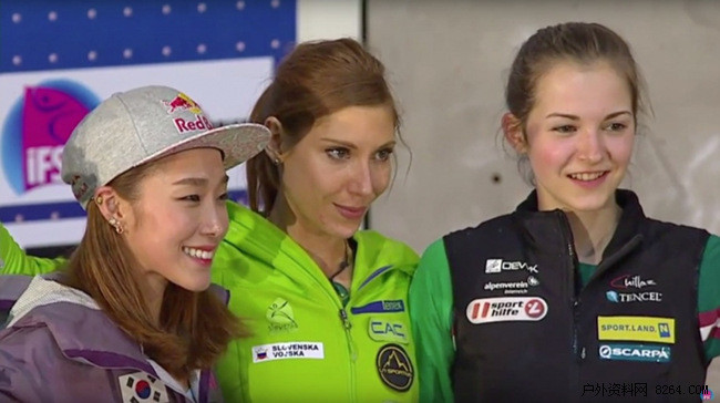 女子方面,东道主作战的Mina Markovic在决赛中与奥地利的Jessica Pilz得分相差无几,最后Mina凭借小分取得胜利,并以总分527.00稳稳获得本年度难度女子总冠军头衔;总分榜第二名则是来自韩国的Jain Kim,不过她赢得了2015世界杯攀岩赛女子总冠军。