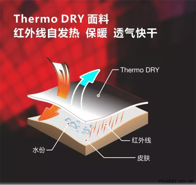 Thermo DRY 面料,超细丹妮特殊涤纶与天丝混纺,添加10%氨纶成分,属放热型面料。可将人体红外线转换成热能,具备双重蓄热保温功效。高弹力且质地超柔软,触感舒适。