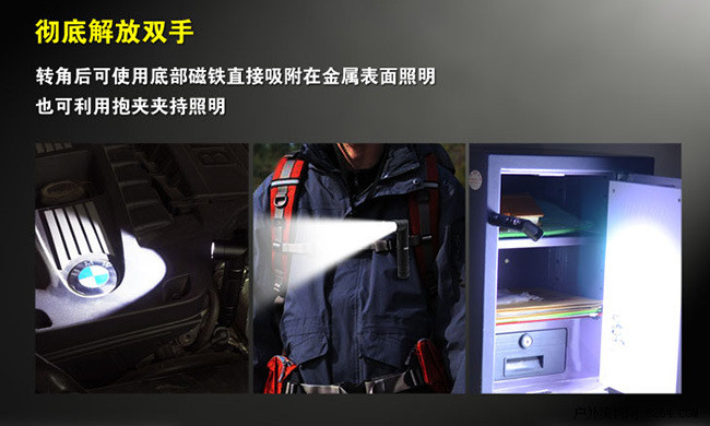 独特转角照明方式,满足使用者多种场合照明,头部转角可根据使用方向进行0-90度调整。转角后可使用底部磁铁直接吸附在金属表面照明,也可利用抱夹夹持照明,解放双手。迷你USB通用充电方式,充电迅速,方便使用。高亮1080流明,最长续航220小时。