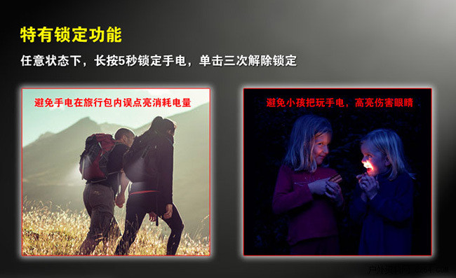 特别为侧面开关设计的锁定功能,锁定后避免在旅行包内误点亮消耗电量,也可避免小孩把玩,高亮误伤眼睛。智能温控系统,最大限度的保护LED及内部元器件,以保证产品安全稳定的运行,更可靠更安全。