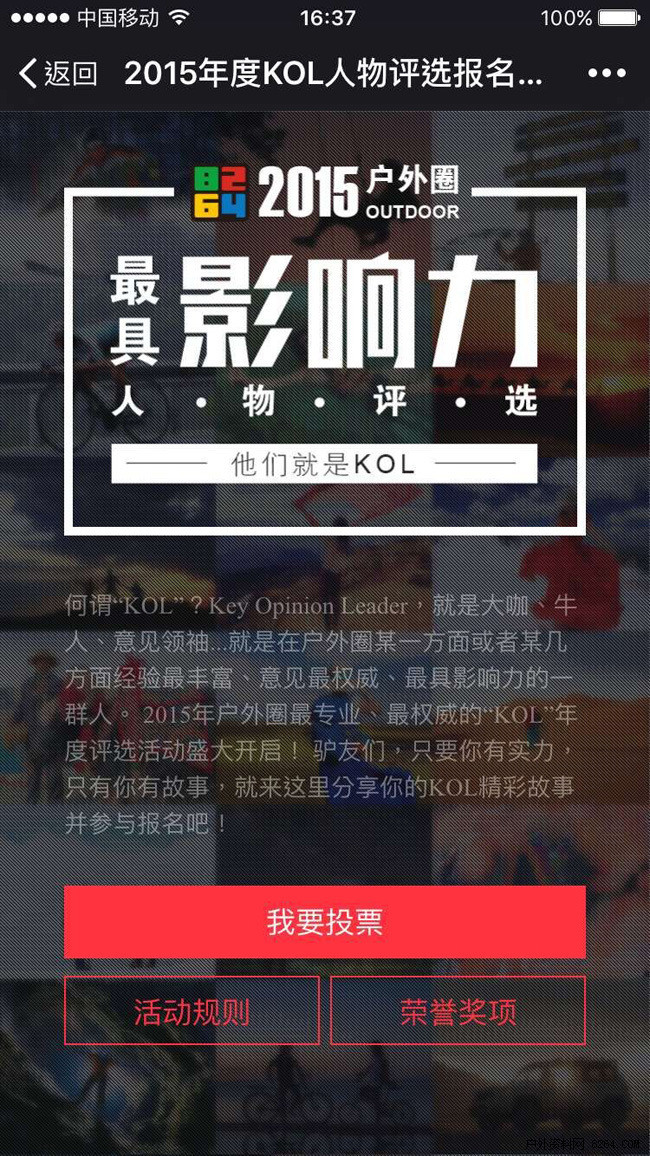 11月25日,由8264户外资料网主办的户外圈最具影响力KOL人物评选活动,正式进入投票环节。截至到26日16时,已收到来自徒步、跑步、山岩、摄影、滑雪、骑行、装备等10个品类共计52145人次投票,在不到2天的时间内就揽获近5万人次关注,敢玩会玩的KOL再次展示了其一呼百应的传播力量。