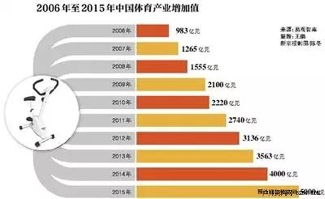 易观智库数据显示,2014年中国体育产业增加值为4000亿人民币,占GDP比重约0.6%,与一般中等发达国家1.5%的水平还有很大差距。