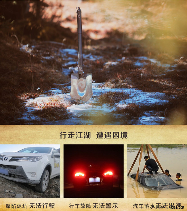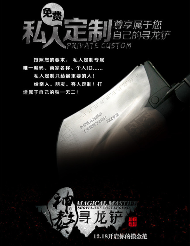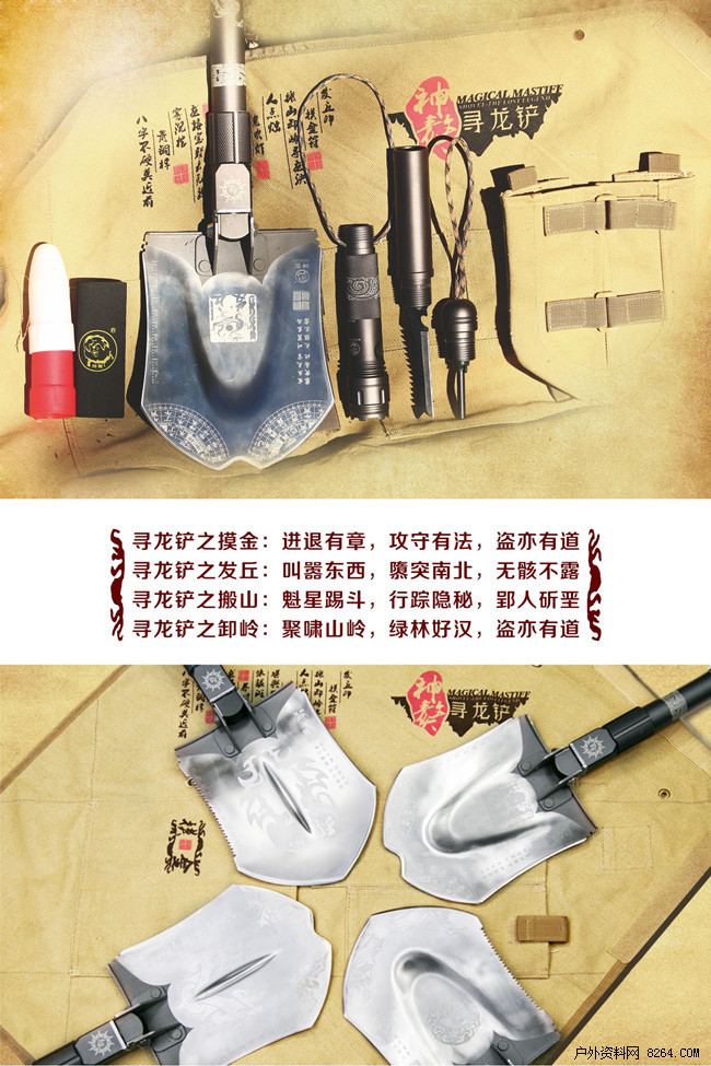 可曾记得鬼吹灯中唱霸描写的四大门派,各守一行规矩各谙一门绝技,进出墓穴神乎其神你是否也曾幻想过自己也是那身怀绝技的盗墓高手?现在机会来了!多吉神獒铲岁末巨献,采用了全新转换结构以及精湛制作工艺推出了-寻龙铲! 摸金 发丘 搬山 卸岭全球限量2000套经典纪念版!它拥有惊艳的设计无处不体现工艺的精湛与结构的新颖,功能更全更强大、使用更方便、设计更巧妙、一铲百变。特别是独创式的铲头设计满足了不同条件对铲的需求,可转换式鸭嘴镐在使用的同时更体现了设计的精妙,小巧实用。是户外装备、旅行、探险、徒步、极限运动的必须品。