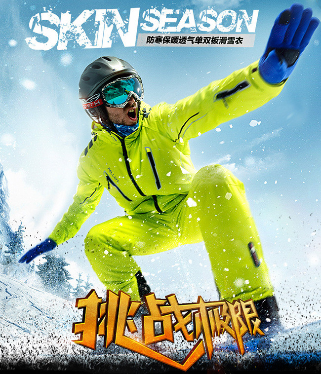 衣服采用全防水拉链设计,内侧设计有手机收纳口袋,肩部防滑耐磨设计避免背负物品对衣服的磨损。滑雪镜收纳口袋和滑雪镜布,音乐播放器收纳口袋;背部采用透气弹力进口网布,更保暖舒适;腋下透气拉链设计加快透气,下置专业雪服防风裙,运动更加自如。