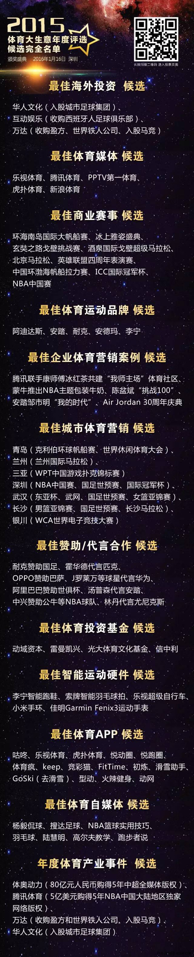 2015年12月18日,国家体育场,2015体育大生意年度评选正式启动,在经过半个月的候选提名补充后,我们今天正式公布最终的候选名单,并开启大众投票。他们谁将斩获殊荣,捧得最佳?1月16日体育大生意年度峰会当晚,我们将举办隆重的颁奖盛典,揭晓谜底。