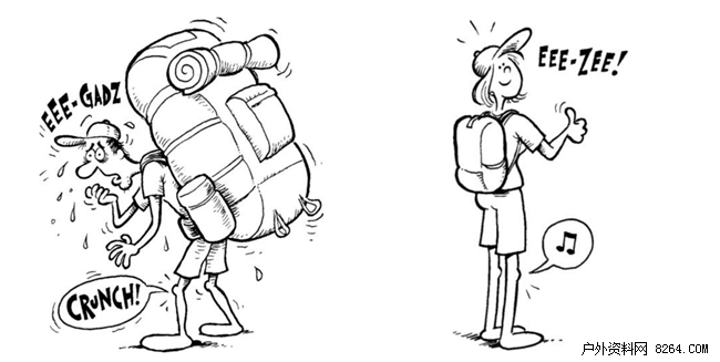 感觉背包太重,需要别人帮你才能背上吗?费尽九牛二虎之力终于背包上肩了,累得你一声大吼尤如狮吼。有过这种体验吗?也许,是时候该了解一下什么是轻量化背包了,背包的重量应占人体重的10%到15%的份额,那么如何把背包的重量降下来,让人体感觉更舒适一些呢?连续几天的徒步和野营,身上背负着超过23公斤的背包其实毫无必要,并且只要掌握一些知识,作一些计划,这样的事情完全可以避免。轻量化背包的概念已经不新轻量化已经成为了户外思想的主流。是什么策动了这场轻量化装备竞争?新型纤维以及保温技术想当然地扮演了主要角色,但是最主要的原因却相当地简单。人们追求更加舒适的穿着体验,背着背包的时候,人们想要利用更多的时间来欣赏风景区,他们只想要携带足够的装备,而不是被太多的装备所损伤。