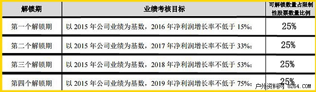 三夫户外为实施本次激励计划建立了配套的《北京三夫户外用品股份有限公司股权激励计划实施考核管理办法》,以考核结果作为限制性股票解锁的依据。限制性股票将在2016-2019年分四期解锁,解锁条件是以2015年公司业绩为基数,第一个解锁期2016年净利润增长率不低于15%;第二个解锁期2017年净利润增长率不低于33%;第三个解锁期2018年净利润增长率不低于53%。第四个解锁期,2019年净利润增长率不低于75%。