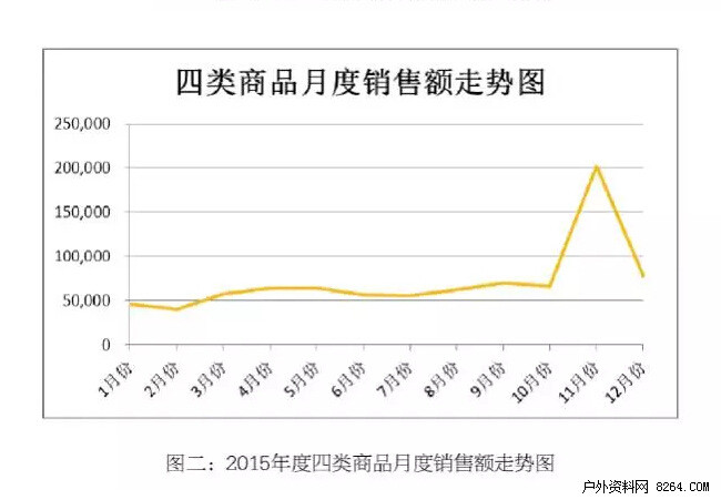 从2015年四大类商品月度销量走势图来看,受“双11”、“双12”、“圣诞节”等年底天猫平台集中促销活动因素影响,在11月、12月中,四大类商品销售额出现明显高峰,成为各大运动品牌冲击销量的最佳时机。而1月、2月,销售情况较为平淡,销售额也为全年最低。