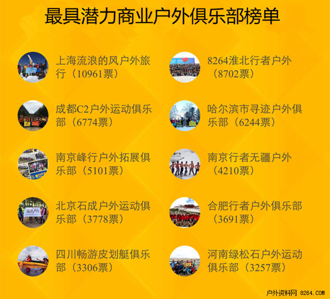 12月30日,历时半月之久的2015中国户外产业年度评选——商业户外俱乐部票选活动完美落幕。根据票选结果及评委会综合考核,本次评选将颁发“最具实力商业户外俱乐部”和“最具潜力商业户外俱乐部”两大奖项,前者除票数外,并考核了该俱乐部的规模、营业额及影响力等综合因素;后者依据微信票选结果得出,是消费者亲手选出的“最具潜力商业户外俱乐部。”