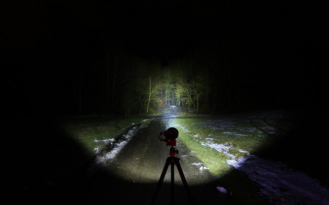 四颗 CREE XP-L HI V3 LED灯头光斑相互交错集中又扩散,使得光斑有一个中心光柱这个光柱可以照射的很远1003米绝对没有虚标,强悍的是在这同时它还有这不错的照明范围,以下几张图片我觉得足够说明问题了。这里说一下这款手电偏中白光。