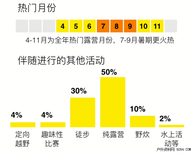 露营大会属于户外休闲类活动,每年热门月份为4月至11月,其中7月至9月暑期更为火热。除纯露营活动外,举办大会活动同时会举办多种多样的活动丰富露营活动,其中徒步占30%,野炊10%,定向越野4%,趣味性比赛占4%,水上活动2%