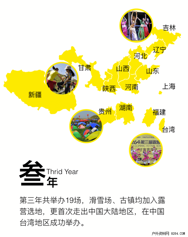 2013全国露营大会举办第三年,当年共19场,滑雪场、古镇均加入露营选地,更首次走出中国内地,在中国台湾省地区成功举办。