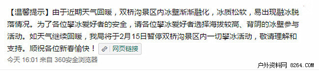 由于近期天气回暖,双桥沟景区内冰壁渐渐融化,冰质松软,易出现融冰脱落情况。为了各位攀冰爱好者的安全,请各位攀冰爱好者选择海拔较高、背阴的冰壁参与活动。如今后几天天气继续回暖,我局将于2016年2月15日暂停双桥沟景区内一切攀冰活动,敬请各位攀冰爱好者理解和支持。