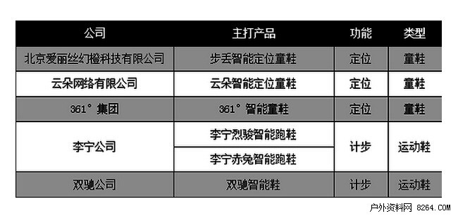 相比去年,今年智能鞋产商数量有所增加,数据显示,从2014年到2015年,有超过10个智能鞋品牌亮相市场。其中传统鞋企数量增幅最大,目前数量已经超过互联网公司。而目前市场主流的智能鞋品牌有5个,如表格中所示。