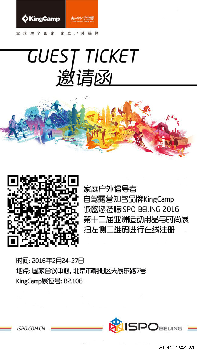 在ISPO BEI JING2016中,KingCamp将打造最自然露营体系,同期举办互动活动。想体验"源于自然、享受自然,在美丽自然山水中,用最自然户外装备露营"的感觉,就来KingCamp展位B2.108,2016年2月24-27日,不见不散!