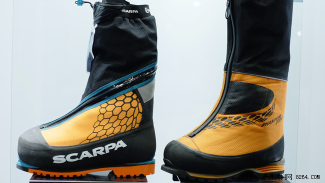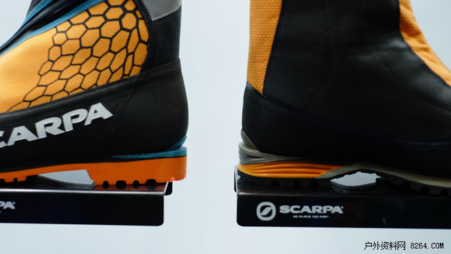 用此款8千米系列举例SCARPA的新款高山靴首先在涂装上进行了改进更加时尚靓丽,拉链改为侧拉同时鞋底的中底改用柔软舒适的材质,体积也有所减小轻量化提高。