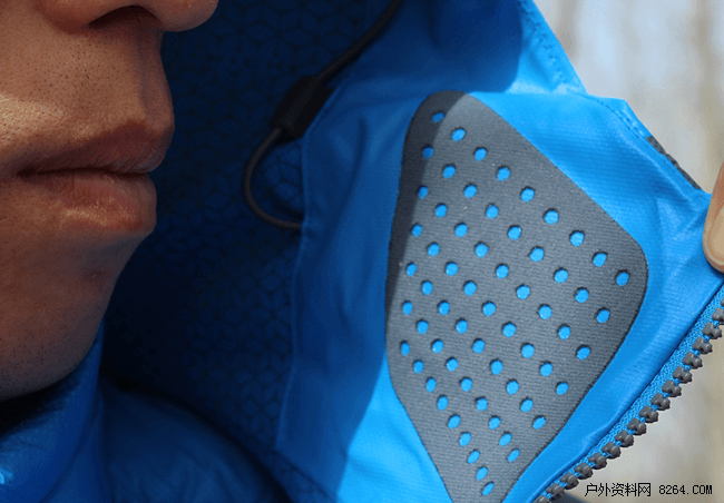 在领口的设计上也是经过精致处理,不仅使用了带有舒适柔软绒面,减少衣服对脸部的重力摩擦,而且绒面还采用了多孔设计,提高了舒适的使用体验。