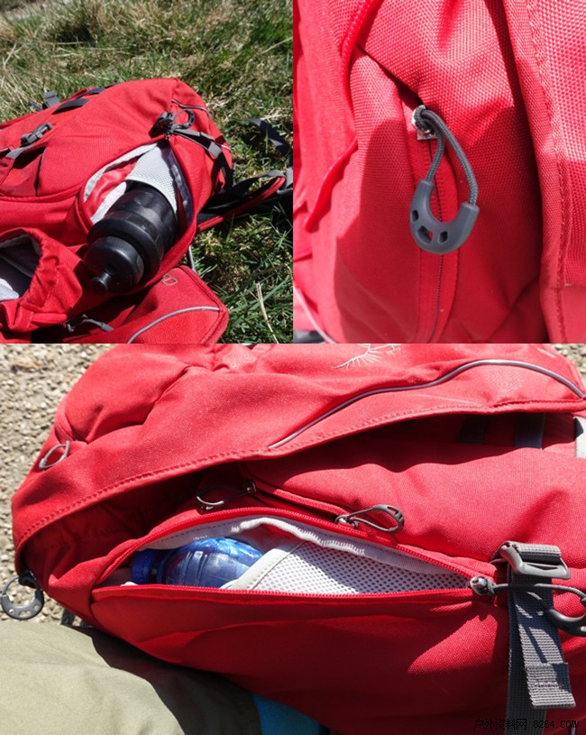 我们在测评的一开始就说这个包功能很丰富。有着这么多口袋,功能当然多。我们非常喜欢这一点,比如水瓶子就不用挂在包外面了。虽然从口袋里把水瓶取出来需要些额外的动作,但是这些动作很简单,并且侧面口袋能够装得下相当大的瓶子。更酷的是这些口袋都不会占用主仓内的空间。你可以把很多必需的小物件放在这些口袋内,同时在主仓内还保留足够的空间。