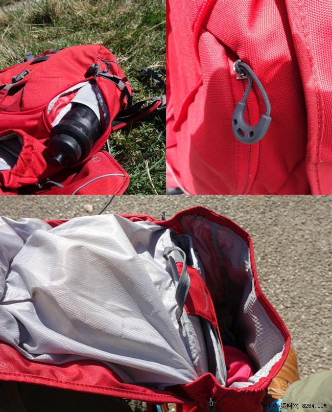 现在来说说这个上翻式的盖子,这是跟以往不同的东西。它很大,并且跟通常的户外包不同的是它可以用快卸扣扣住。在包的底部Osprey装了一些厚实的织带,上翻式的背包盖可以跟织带上的快卸扣扣在一起,并且能根据装的东西的多少很方便的调整长度。在这里有一些不太好的设计,这个我们之后会说到,让我们先说好处:上翻式的盖子用一只手就很容易扣上,并且能根据包内物品的多少方便的调整织带的长度,给整包提供了初步的防雨能力并且能有效保护包前面隔层内的物品。