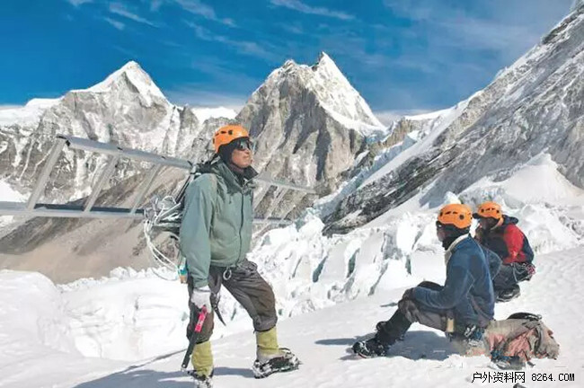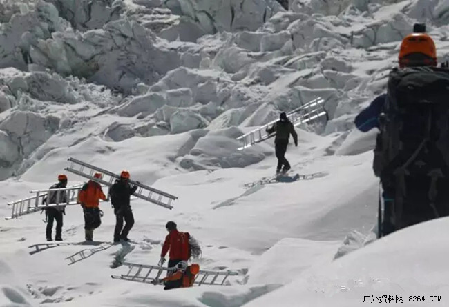 距他们开始工作已经一个星期,但因安装装备的工作难度,他们仍然没有到达一号营地。“今年通往珠峰的路上有一些冰裂缝和冰洞,”Ang Kami Sherpa说道,“这可能是受去年地震的影响,因而今年我们需要更多的铝合金梯子来穿越那个冰裂缝和冰洞。”
