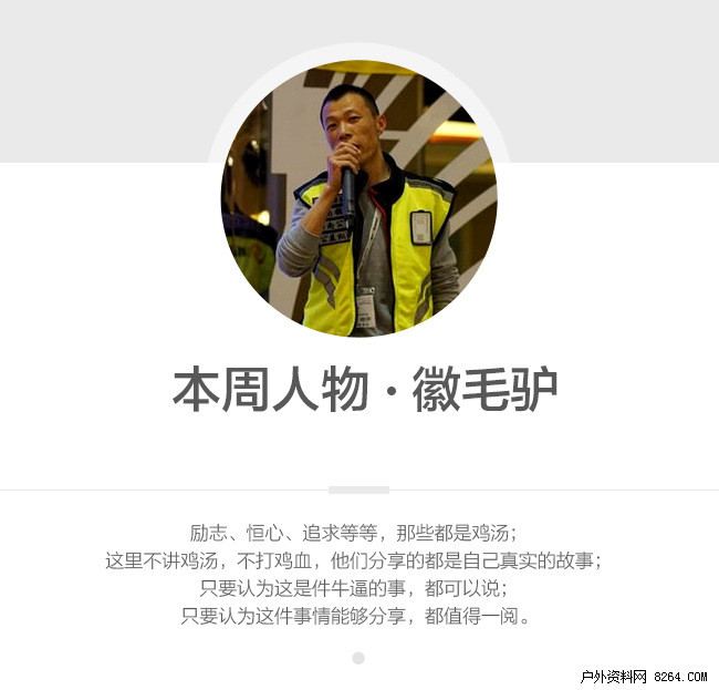 本期分享人圈里人都亲切的称呼他“徽毛驴”,他创立的户外俱乐部也叫徽毛驴,一起听听他的故事: