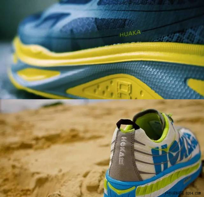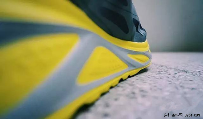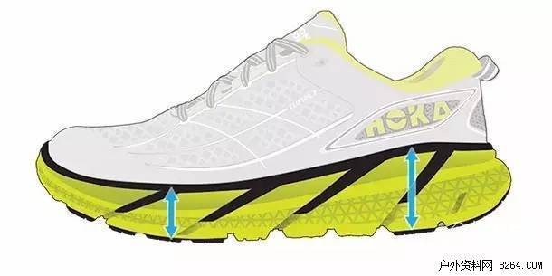 Hoka One One 把鞋底设计成了船形,典型的两种鞋底落差:分别是后跟 35mm 前掌 31mm;和后跟 30mm 前掌 24mm。