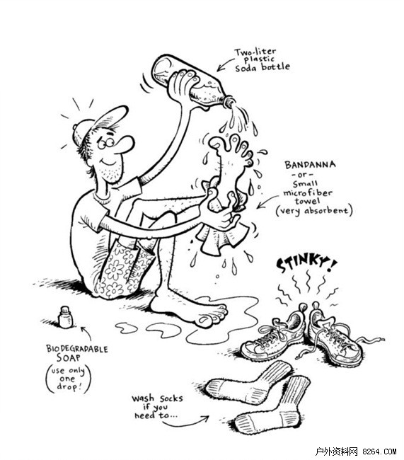 细菌喜欢呆在温暖、潮湿、黑暗的环境中。徒步鞋或靴子正好就是这样的环境!如果天气暖和,能舒服地洗脚的话,那可以在晚上钻进睡袋前洗个脚。睡觉前,很多背包客都会在这时候把穿了一天的袜子洗了,第二天再换上另一双袜子,让昨晚的袜子干上一整天。鞋里的内垫在徒步的时候可以发挥很好的防臭效果,但是你在过河之前一定要先把内垫取出来。因为如果内垫湿了,防臭效果就会收到影响了。