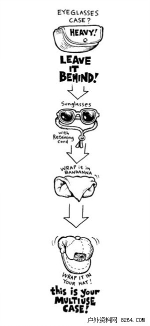 太阳镜应该对长波紫外线和中波紫外线起到100%的防护作用。使用偏振镜片还可以减少水面和雪地刺眼的反光。“中灰”镜片的颜色比较暗,可以更好地防止阳光照射,同时还原事物的真实色彩。如果你要走的徒步路线包括冰川和雪地,就么就应该佩戴那种眼镜旁边可以遮光,鼻子也可以被盖起来的太阳镜。旁边遮光的太阳镜可以减少从旁边反射进来的光线。太阳镜除了可以防止阳光照射,还能抵御风沙吹入眼睛。超轻量化背包客有时候会把他们的太阳镜放在抓绒袋或多余的徒步袜子里,其它简易的保护罩也行。但如果你的太阳镜非常贵,那就把眼镜装在一个结实点的眼镜盒里。这样做虽然增加了一点重量,但眼镜受到的保护更周到。