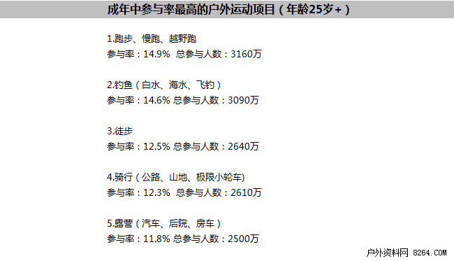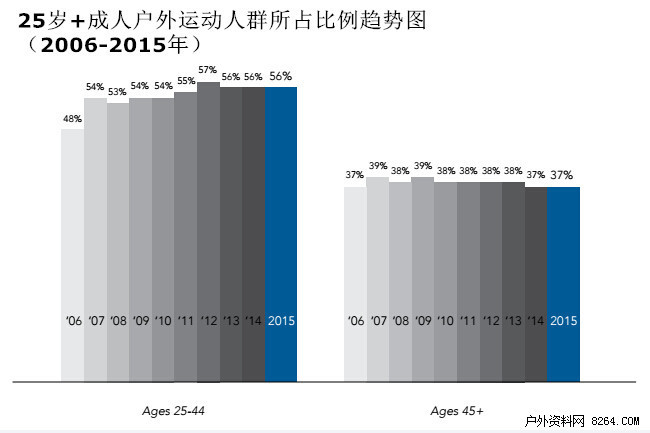 2015年,近半美国人——48.4%,至少参加过一次户外活动。而这1.424亿美国人2015年参与户外活动总次数为117亿。