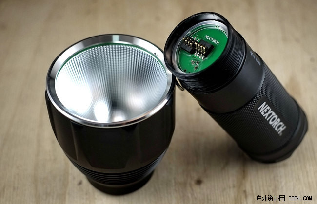 头部触点采用了多点直接接触样式,灯头部位与尾部的平面触点简洁实用,从筒身内部可以看出弹簧的触点与尾部平面触点都是正负级相同的设计。