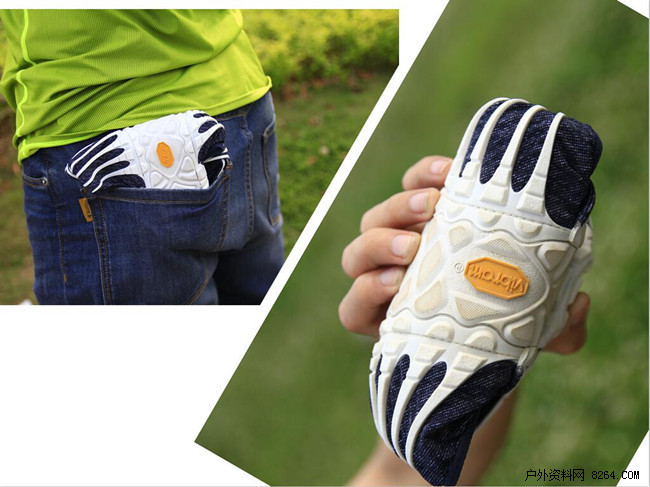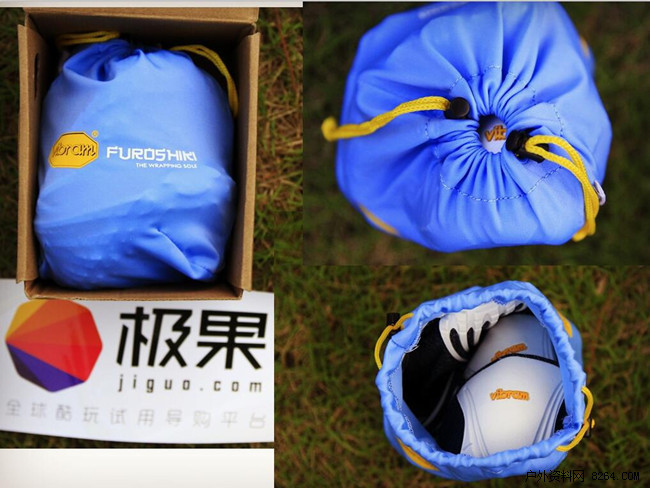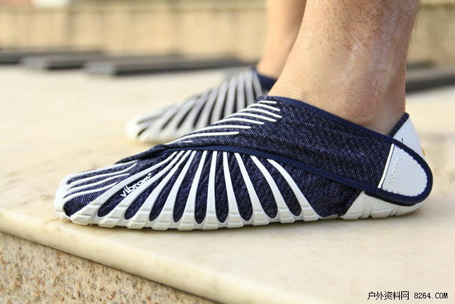 官方显示弹性面料是莱卡得,非常轻薄有弹性。Vibram 橡胶延伸至鞋头和两根交叉带,将连接鞋底的布料交叉,包在脚面上,并折叠到脚跟,类似魔术扣材质能自动固定住,这样 Furoshiki 就变成一双天然合脚的鞋子。