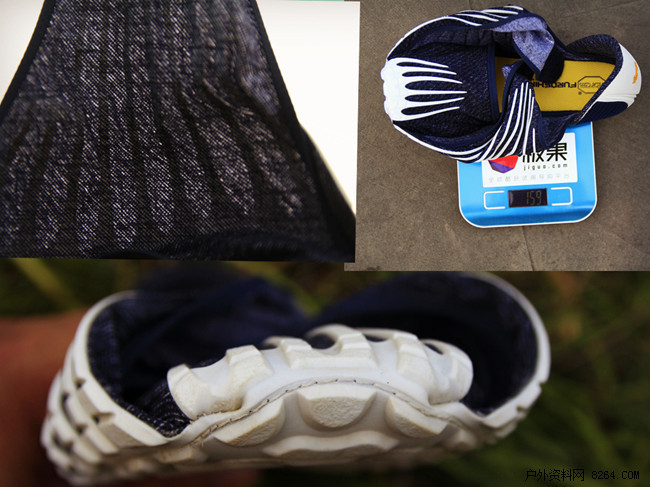 Vibram 橡胶底连接着弹性面料,让整双鞋看起来只有鞋底,没有鞋面。鞋内底衬黄色得速干材料略有厚度,利于吸汗。