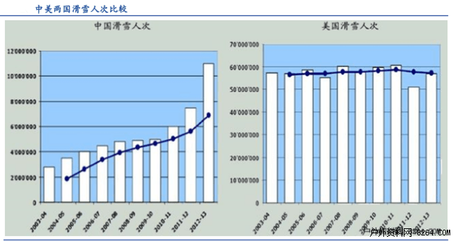 2014年全球滑雪人口约1亿,人次近3.5亿,即全球滑雪人口平均每年滑雪3.5次。对比我国情况来看,而我国滑雪人口平均每年滑雪1.3次,滑雪人口几乎等于滑雪人次,远低于全球平均水平。主要原因是我国滑雪产业尚未发展成熟,滑雪运动普及率较低,更多的是80、90后年轻人体验式滑雪,真正的滑雪爱好者在中国还没有形成较大的团体。