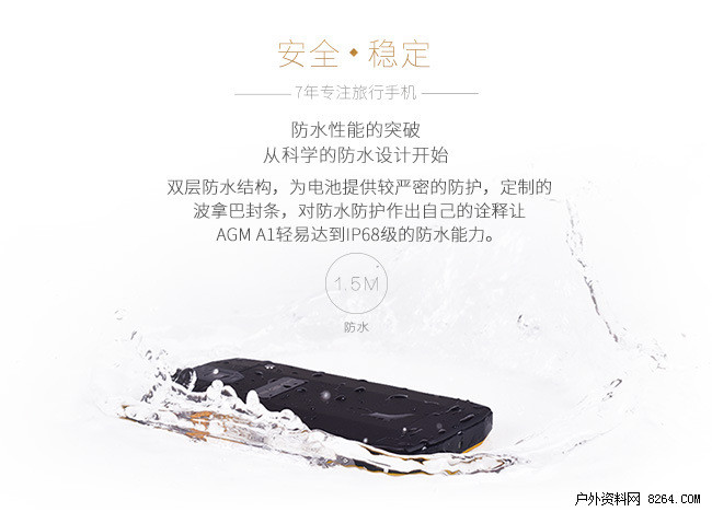 关键词二:IP68防护等级旅行中的环境相对于城市生活更加的复杂,手机也面临着各类问题,例如跌落,落水,刮伤等等,AGM A1的十二面切割设计,能够让其轻松面对跌落,搭载的进口Dargon触摸屏,硬度是一般屏体的6倍,防摔防刮。