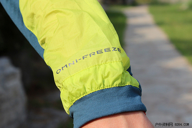 袖口带有Omni-Freeze®Zero 奥米•专业降温技术LOGO标识,也是这件越野跑夹克的独树一帜的面料科技。