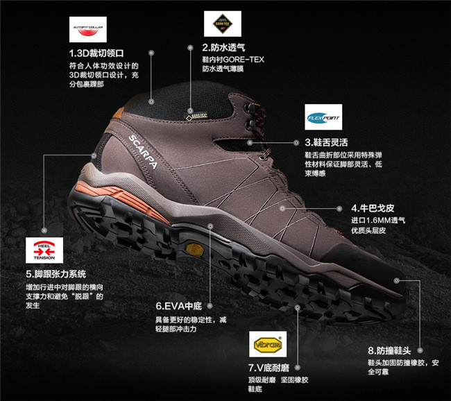 鞋款使用厚度1.6毫米的牛巴戈皮以及GORE-TEX防水结构,中帮结构提供出色的横向支撑,结合脚尖的橡胶保护片,整体保护性能优异。特针对亚洲人脚型开发鞋楦,最大限度保证各种脚型拥有高适配度。Scarpa专属的Vibram Dynatech 3鞋底排泥性和抓地力出色。