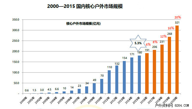 2015年核心户外市场规模达到180亿元人民币,较2014年的171亿元人民币,增长了5.3%,增长幅度较上一年度进一步下降。
