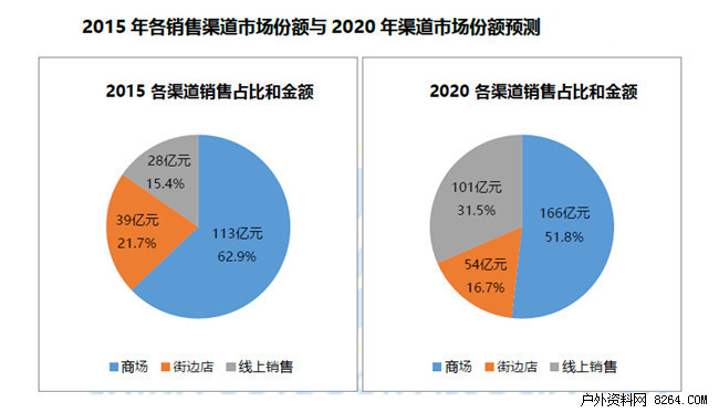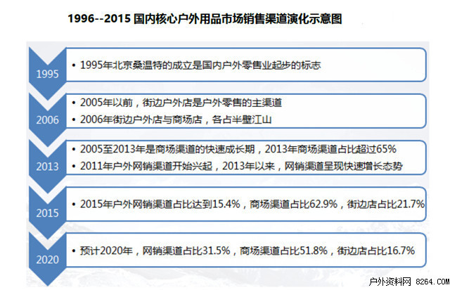 户外用品销售机构包括各级代理商、经销商等。本报告关注的重点是户外零售终端,主要包括:百货商场渠道、专业户外店(街边店)和网络销售渠道。